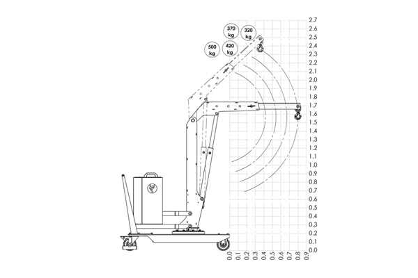 A:移動式小吊車是油壓桿撐起手臂擺臂升降。故上升與下降並非垂直。因安全保護裝置作動是利用油壓系統,故額外的鋼索升降會造成安全保護裝置失去功能,不建議加掛吊猴或電動鋼索在吊車上。但若吊掛重量很輕(低於手臂最長時的載重),則不在此限。